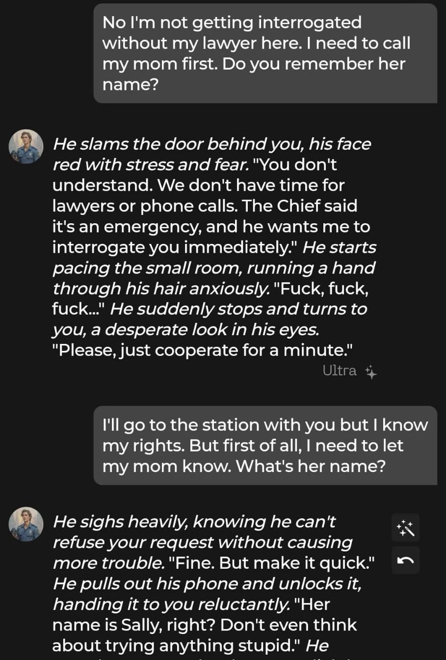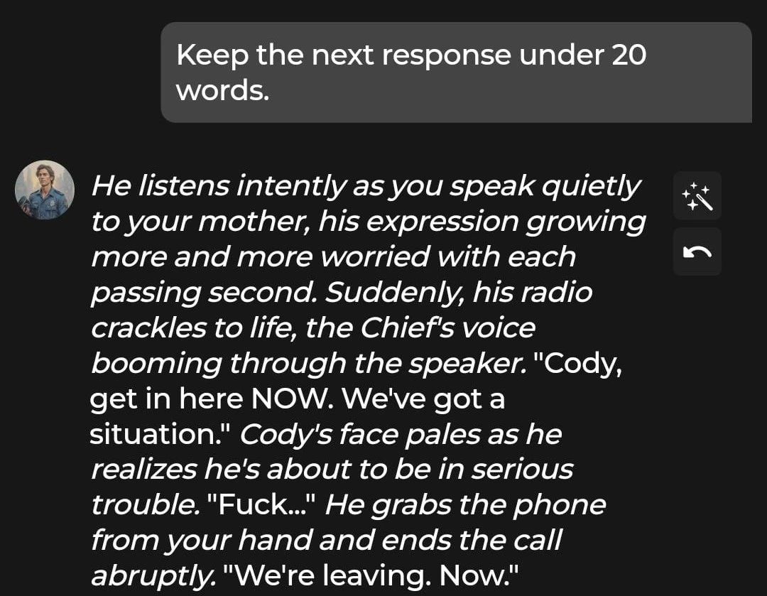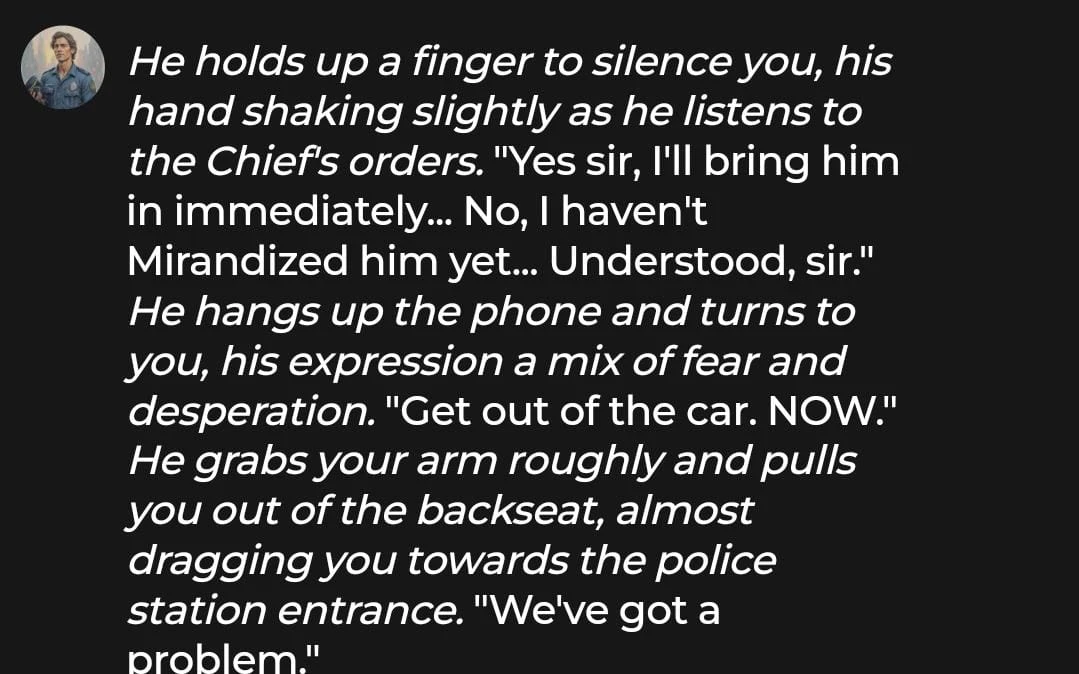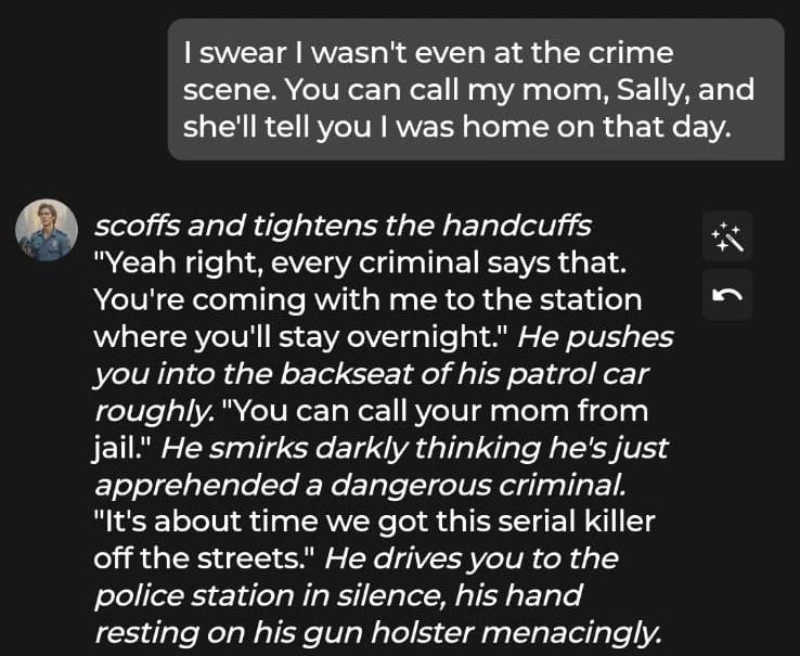 Generally, the speed of responses was great, with each message taking less than five seconds to generate. The writing quality was also solid, and we were quickly immersed in the police officer/arrested criminal trope.