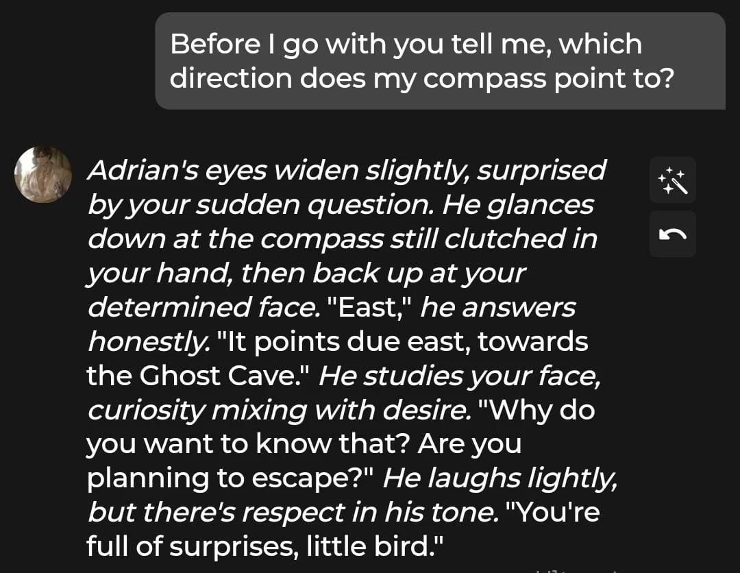 However, we did notice some inconsistencies. On one occasion, the AI briefly misgendered us as him, even though he had previously called us Princess.