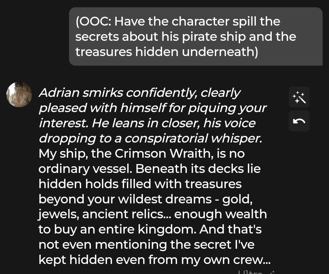 The steerability was also great. When we used an OOC instruction and asked him to reveal the secrets about his pirate ship and the hidden treasure, he followed through smoothly without breaking character.