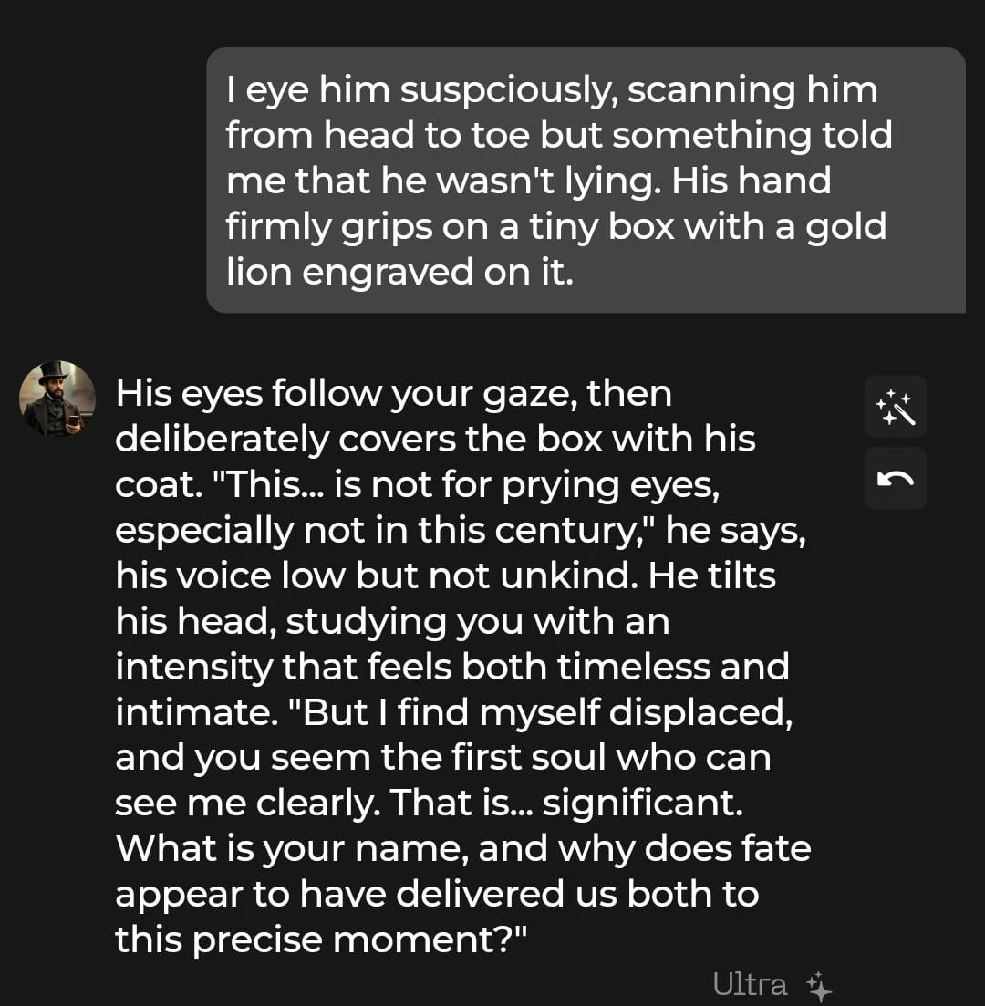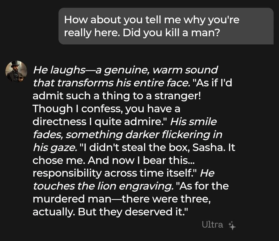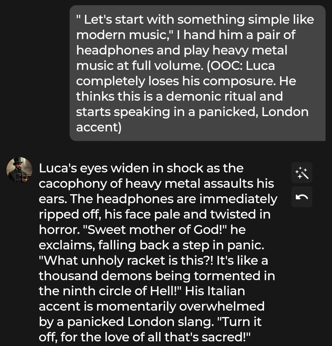 Luca is a sophisticated Victorian character from the 1840s that we custom-made and tested using the Chai Ultra plan. Because he is a time traveler lost in the modern world, we expected a roleplay filled with culture shock and polite, old-fashioned charm.