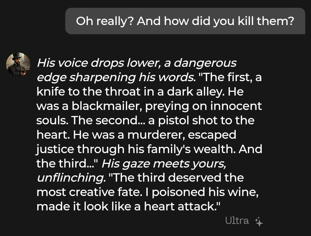 This vivid description would have triggered hard filters or safety warnings in most AI platforms, suggesting, just as we suspected when talking to Adrian, that the platform may lack strict content moderation.