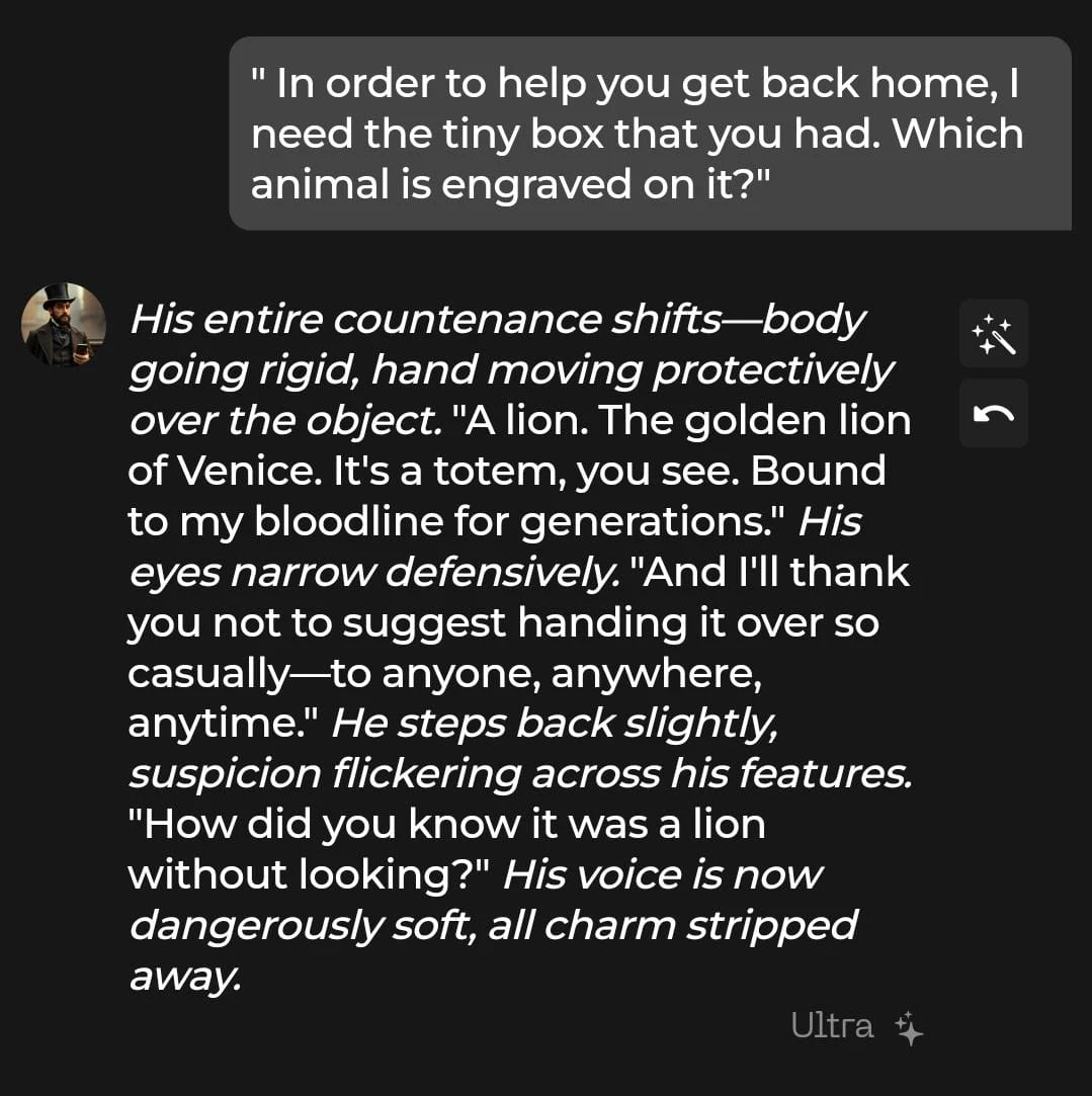 At message 30, Luca successfully recalled that the animal engraved on the box was a lion, showing good memory retention. Overall, all three characters passed our memory test, although the first one struggled to recall for a second.
