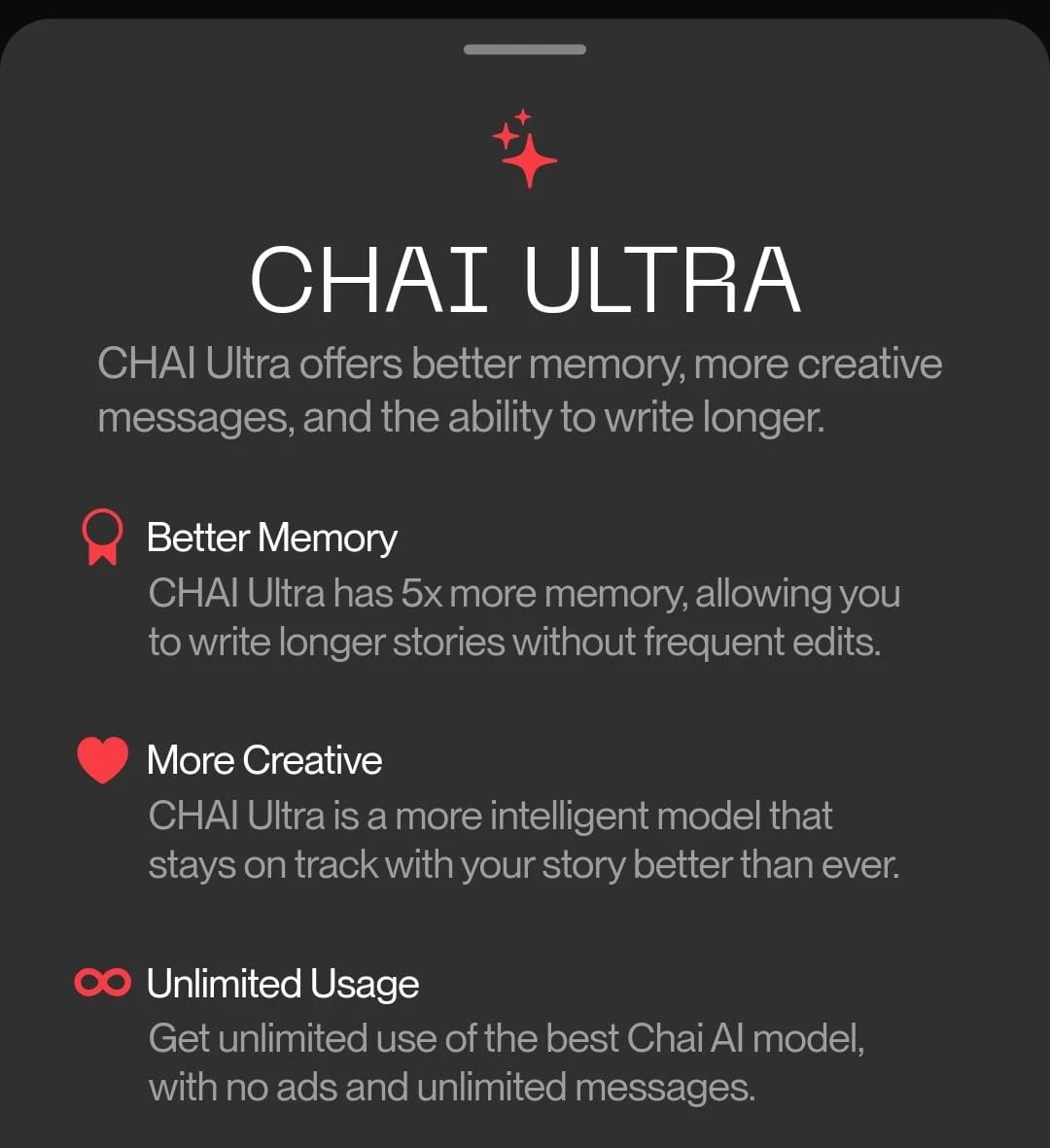 Memory | Users on the Chai Ultra and Chai Premium plans get access to enhanced memory that retains key details beyond 25+ messages. |
