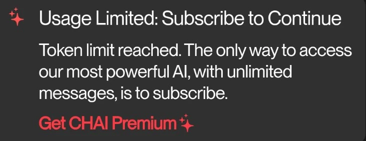 - Limited: On the mobile app, Chai AI markets its app as ‘unlimited messages’, but Free tier users are limited to approximately 70 messages every 2.5-3 hours. Once you reach the limit, you have to wait or upgrade to either Chai Ultra or Chai Premium to continue chatting. The Free tier also has frequent ads that pop up during the chats and interrupt the conversations.