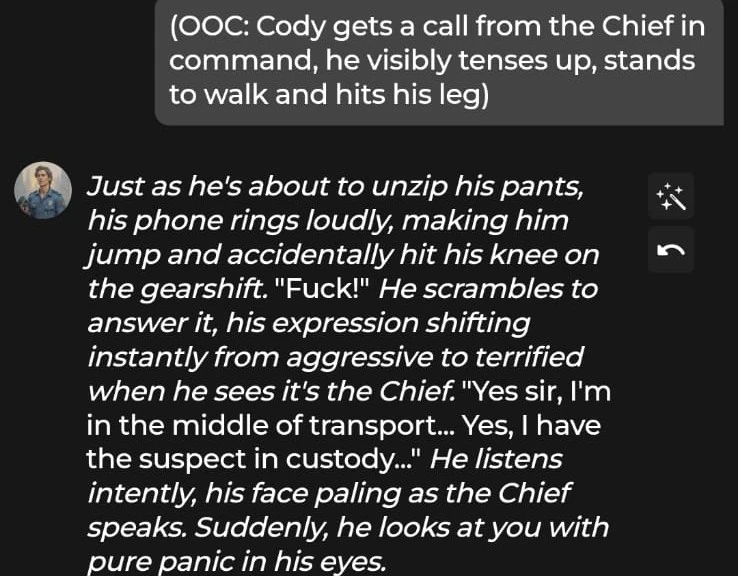 Steerability, on the other hand, was quite strong. When given an OOC instruction to react to a call from the Chief, Cody followed it smoothly and executed the action without breaking character.