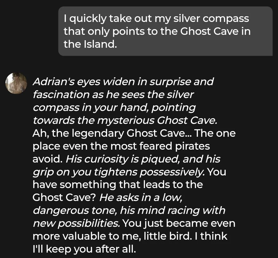 Adrian is an adventurous pirate that we tested on the Chai Ultra plan. He has a mysterious edge, so we expected a classic fantasy roleplay filled with danger and slow-burning tension. Early on, the interaction felt immersive, and the character stayed mostly in line with his pirate personality. As the conversation progressed, Adrian remained engaging and consistent in tone. He responded like a seasoned seadog — bold and commanding.