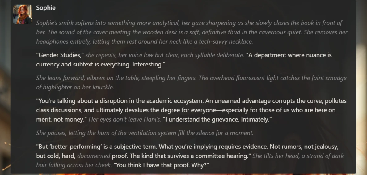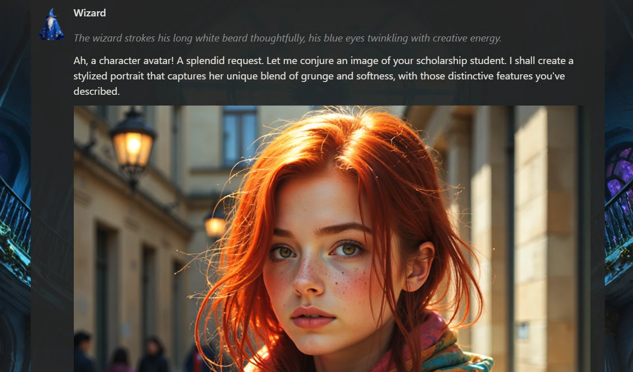 Earlier, we had utilized the Chub AI’s native AI generator, “Wizard”, in creating our character’s avatar, and just like that, our self-righteous scholarship student, Sophie, was created.