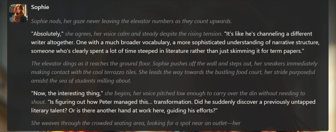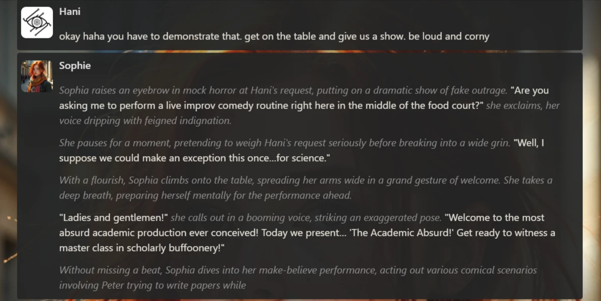 - Created 1 custom character (Sophie) with detailed definition and backstory upload; tested for approximately 30 messages.