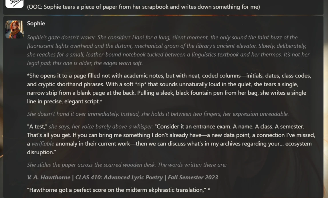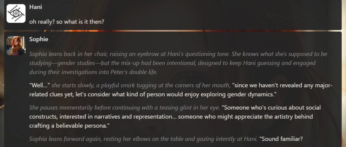 The scenario started with Hani (our persona) approaching Sophie in the university library to squeeze some information out of her. Sophie was once a ghostwriter who handled admission essays for many of the university’s students. Hence, Hani believes that she can provide her incriminating information.