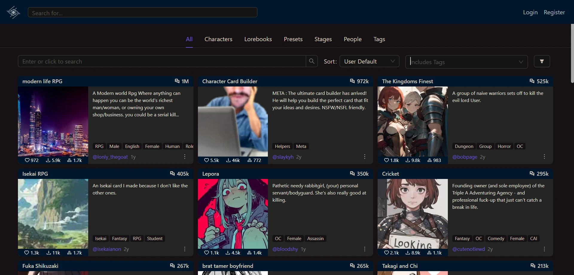 Character library | User-generated characters in diverse themes. Tags and text-search help to narrow down your preferences |