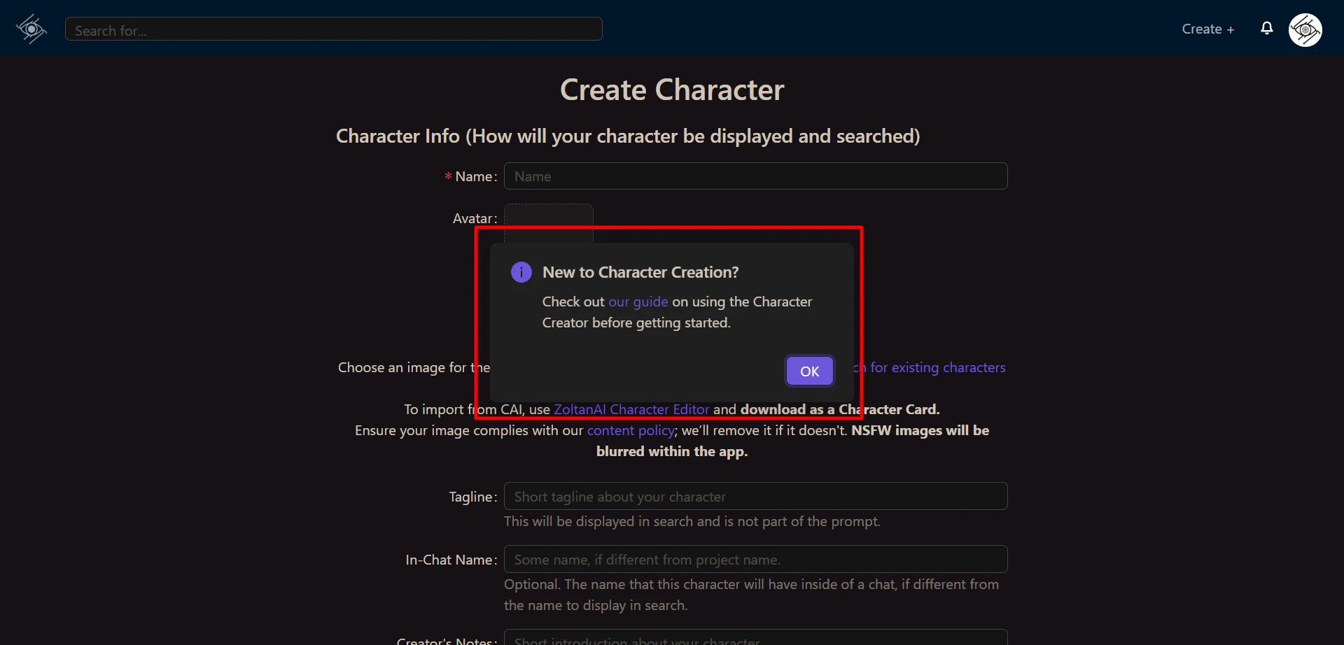 We started off our test sessions by creating our own character on Chub AI. Given the platform’s reputation for in-depth character configuration, we were curious to see how custom characters would be implemented.