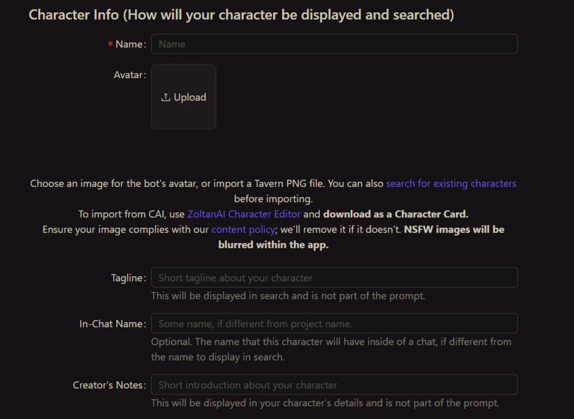 Chub AI’s character creation tools were quite thorough, providing us with extensive basic and advanced fields for optimum character detailing.