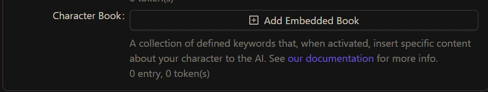 - Character book — defined keywords that insert specific content about your character to the AI.