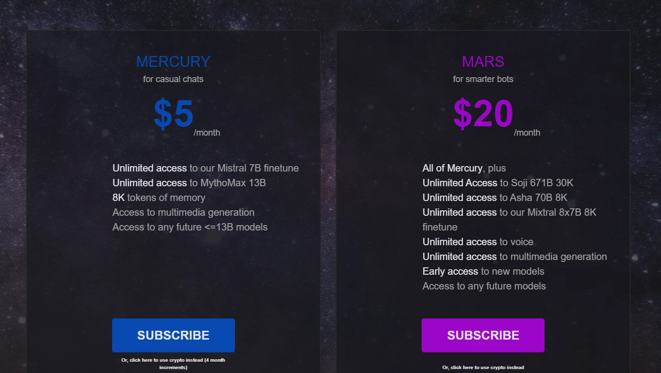 The model names would be confusing if Chub AI hadn't had the foresight to highlight the difference by adding the subscription plan to the names in brackets — Mixtral Variant is a Mars model. At the same time, Mistral Variant is a Mercury model.