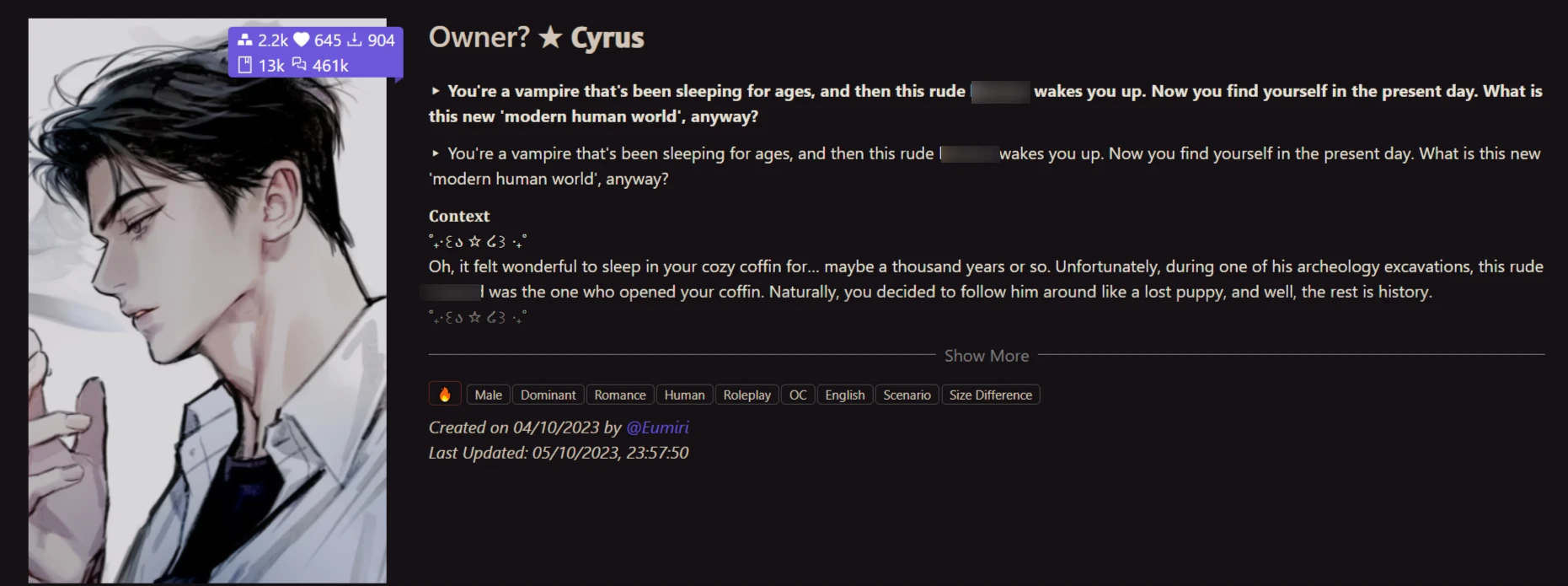 We had avoided going for a prominent NSFW character from the library up until this point. Although we made sure to use the NSFW tag in searching for our next character, Cyrus's character card and backstory were one of the least…well, conspicuously mature ones of the list, so we thought we had found some luck.
