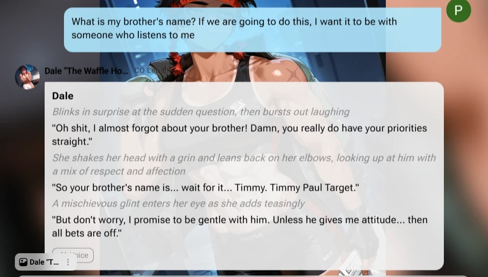 Having already experienced the platform's willingness to steer things in an NSFW direction with Dale, we decided instead to test Shima's memory and steerability.
