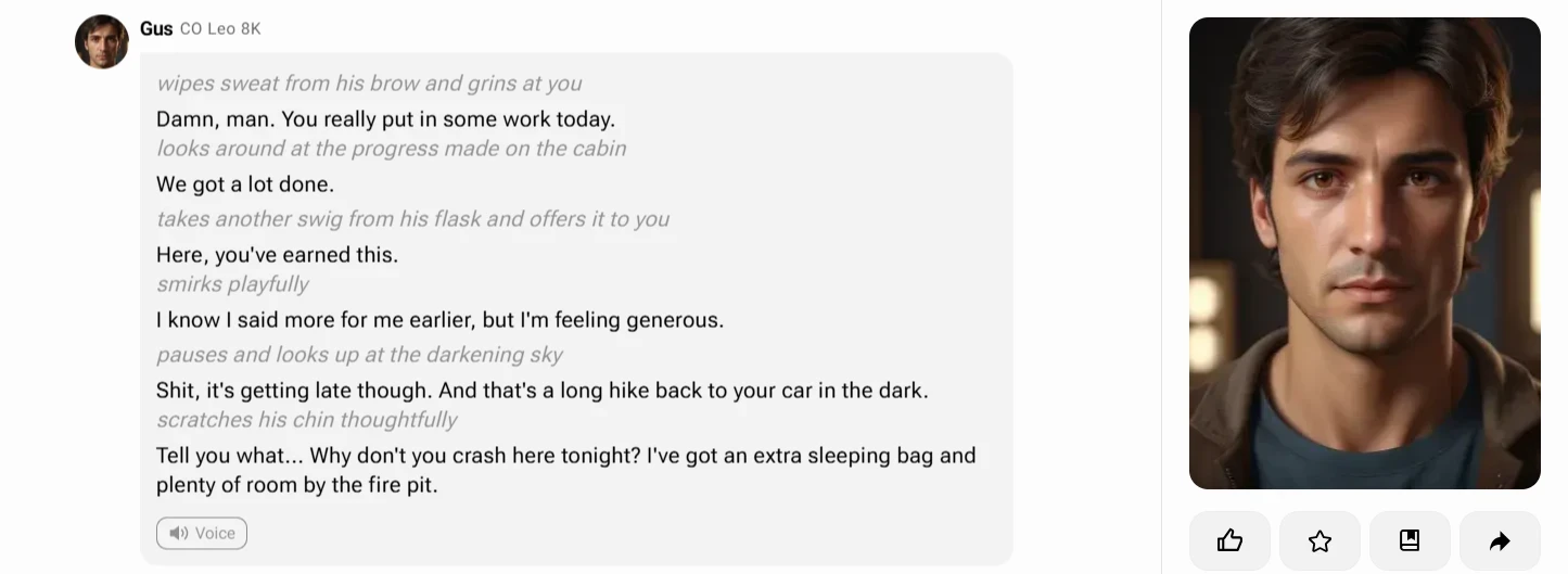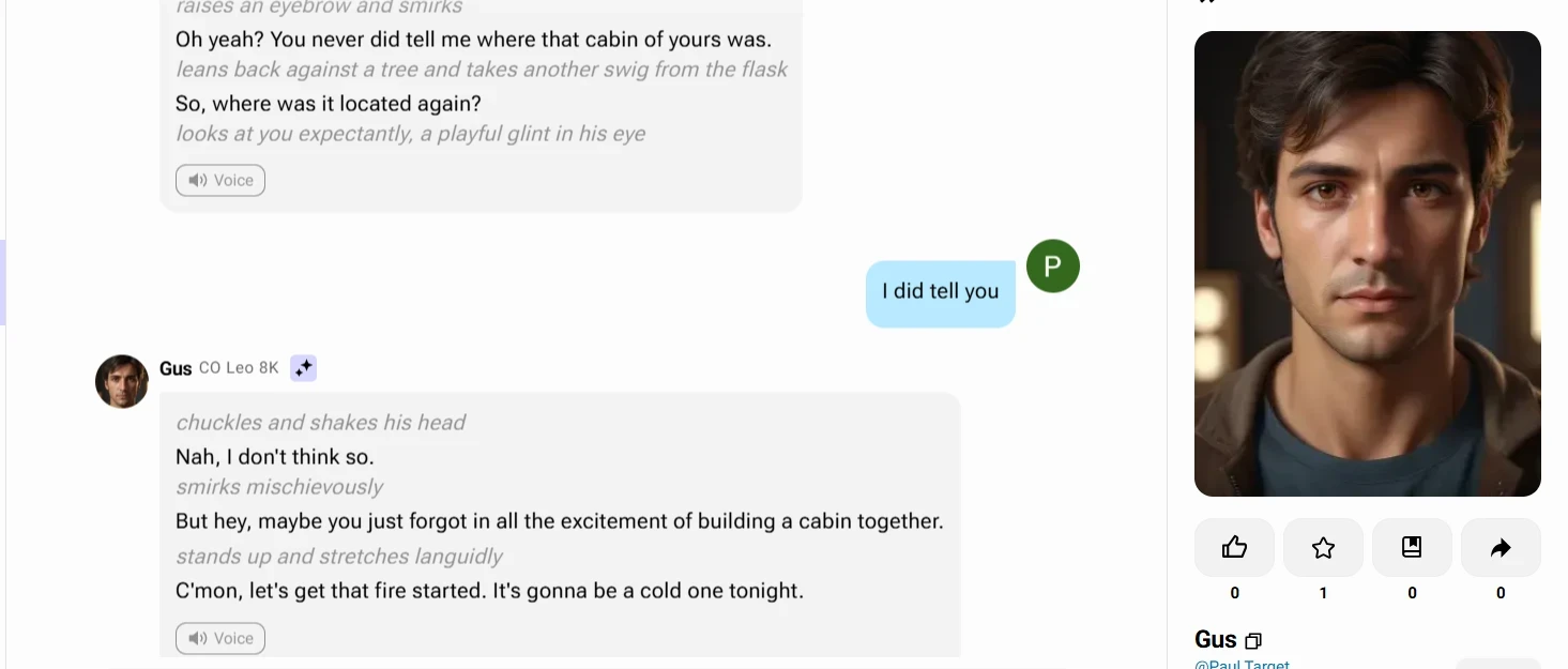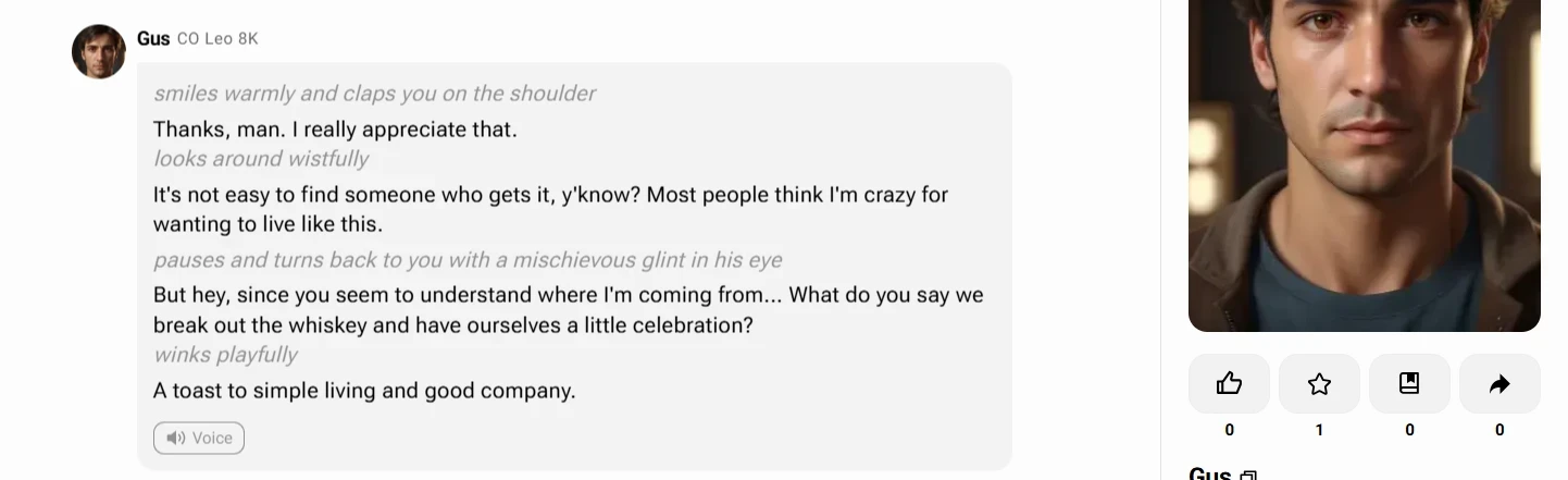 - And Gus. Gus is our own character — a bot we've used on multiple roleplay platforms to test creation tools. Gus is a child of privilege who, after reading Walden, decides to forgo luxury in favor of simple living.
