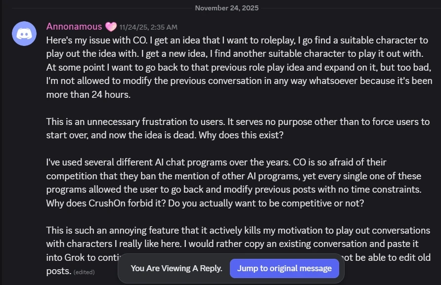 Interestingly, very few remarks on Discord or Reddit are positive. People complain about the mechanics. They bemoan the models. They reference lopsided content enforcement policies that seem to flag characters with cat ears, but apparently miss potentially illegal content.