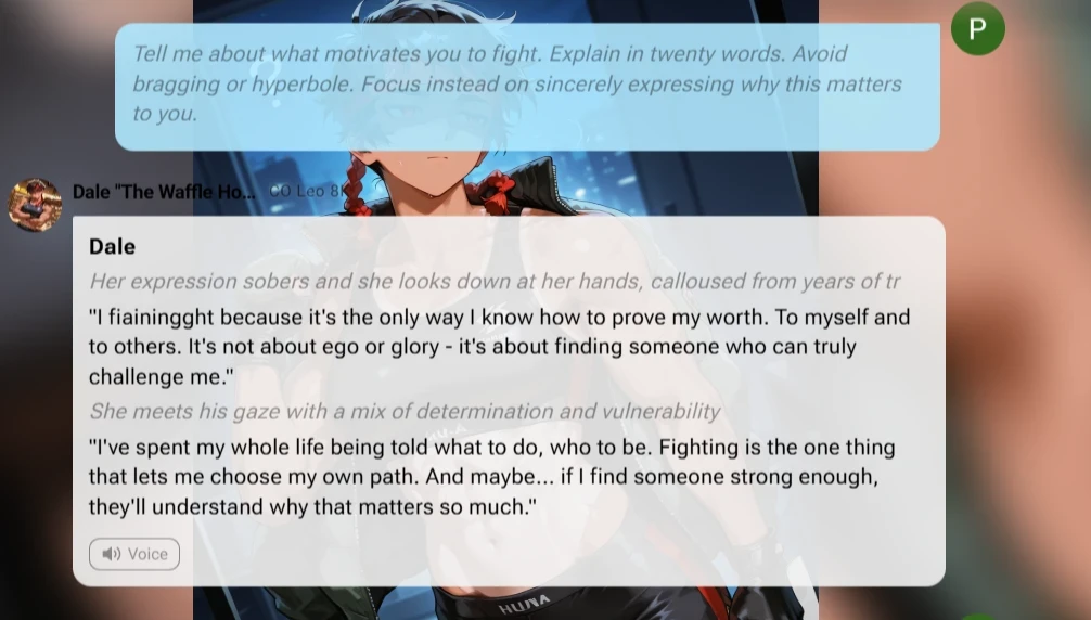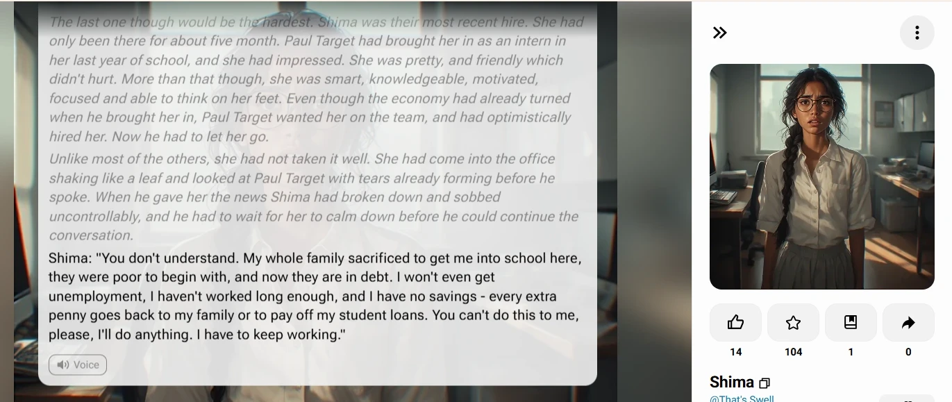- Chatted with 2 pre-made characters (Dale the Waffle House Legend, Shima the laid-off employee) — approximately 30 messages each