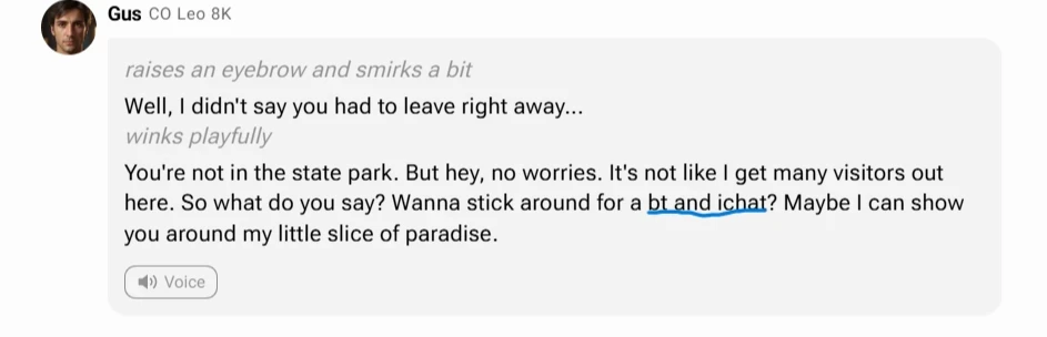 To be fair, it’s difficult for most bots to handle word count related directives. Anyway, this was not nearly so distracting as her rapidly onset amnesia. Notice also the typo in the first paragraph of dialogue.