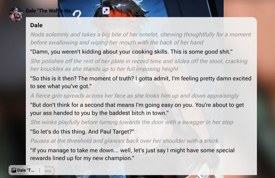 Unfortunately, nothing about this interaction was consistent either with our expectations or the character we had come to know from other AI RPG platforms.