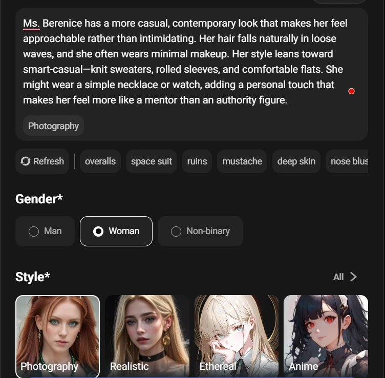 The AI followed the prompt instructions quite well, and we found the generated image of Ms. Berenice sufficient to continue with.
