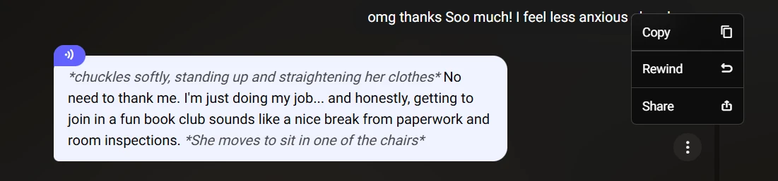 The writing in the standard chat mode was brusque; no-fluff, minimal narration, with one- to two-sentence replies that were to the point and helped keep the conversation moving.