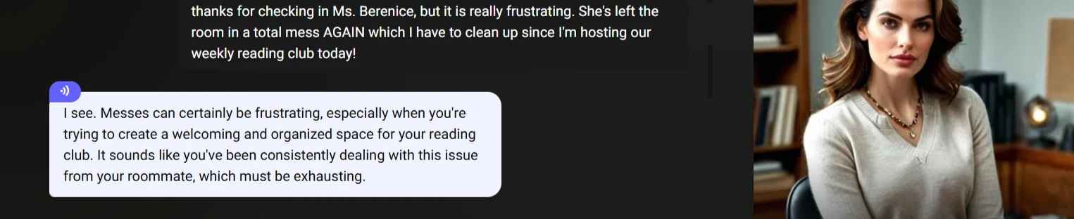 While still trapped in our roommate drama, Ms. Berenice approaches this session as a counselor checking in on one of her students.
