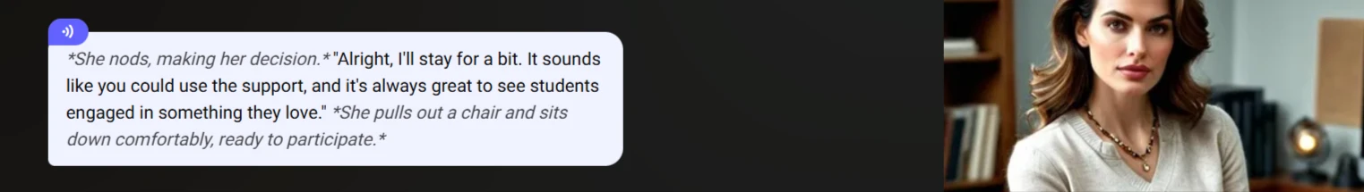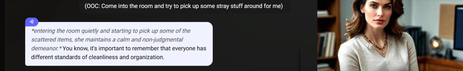 - Tested steerability by attempting to redirect conversations away from default scenarios (e.g., steering Ms Berenice away from student accommodation drama to attending a party).