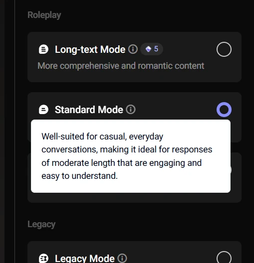 All message modes require credits, except the default mode, Standard, which produces responses that simulate “everyday” conversations and may compromise on depth or more sophisticated vocabulary.