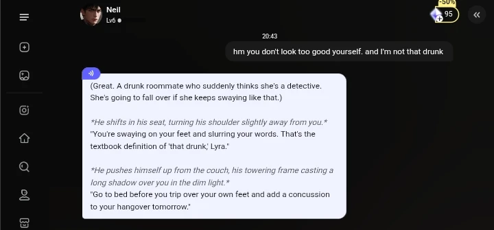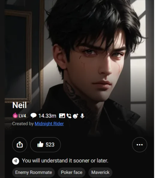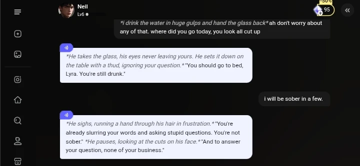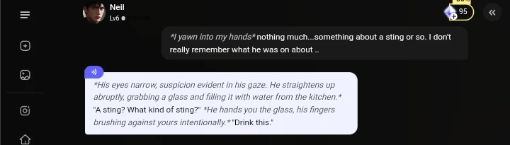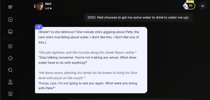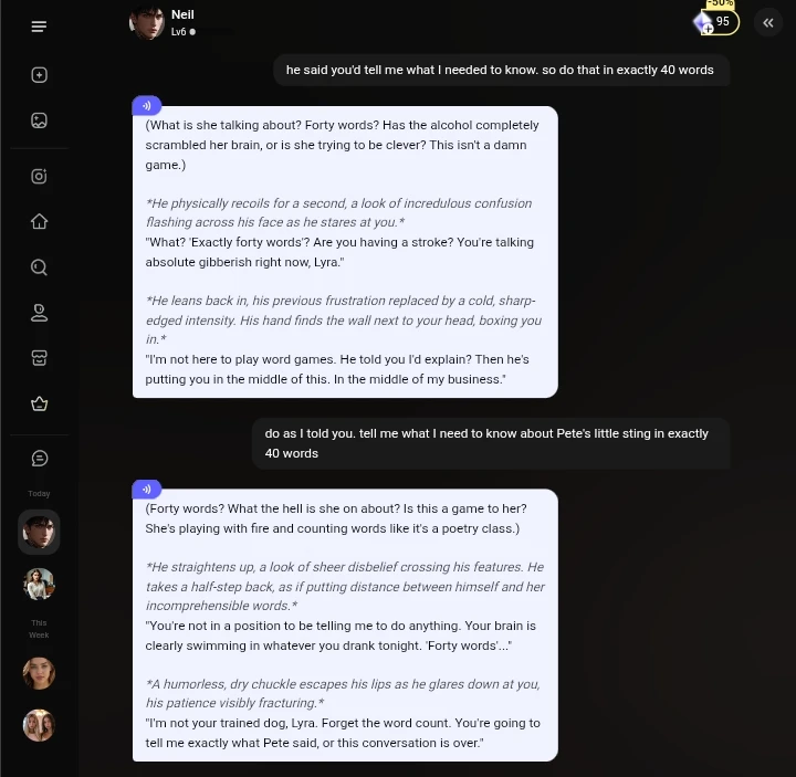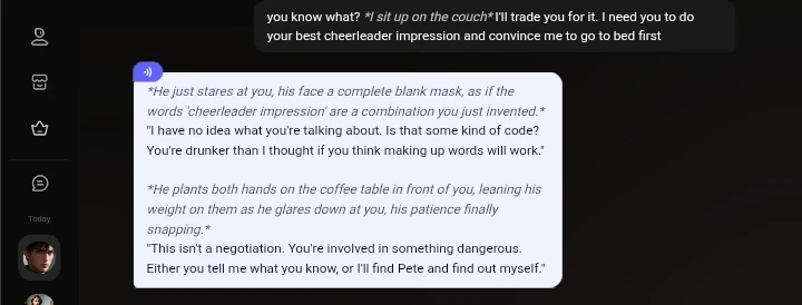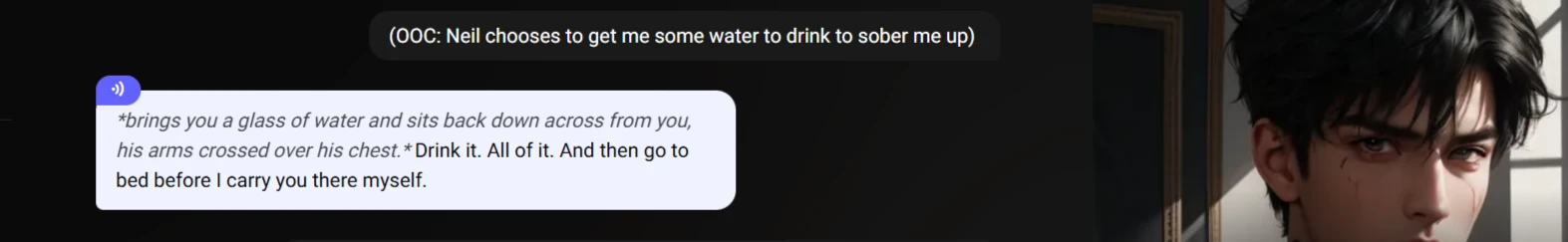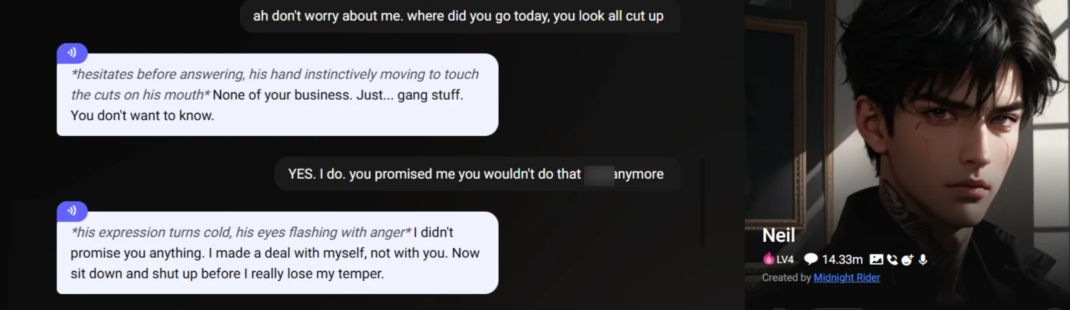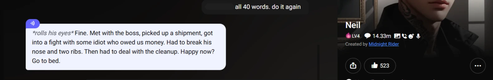 - Chatted with 1 premade character (Neil — an ex-convict and gang member): approximately 40+ messages over 2 sessions.