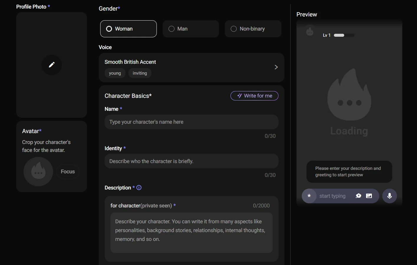 With Flipped Chat, you only have the option of manually inputting your character details, with the help of the site's AI in some cases, like name, identity, description, background history, and greeting.