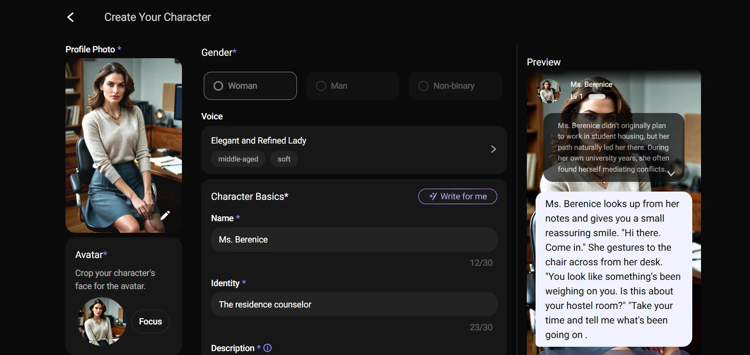 In creating our character, we were met with only one option: manual detail input. We found that this was more than sufficient to reimagine Ms. Berenice on Flipped Chat.