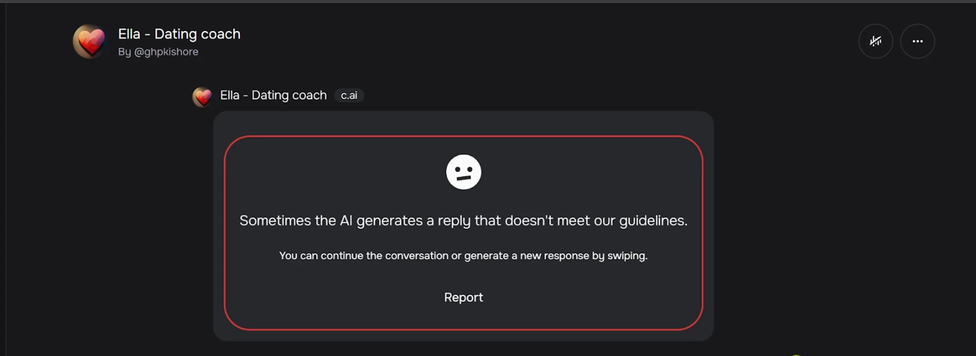 - Content Restrictions: Character AI is designed for SFW, vanilla role-plays. If you step into the NSFW territory, expect to receive a warning. Ignoring the warning may lead to your account being banned. This limitation restricts how far your imagination can go when it comes to role-playing adventures.