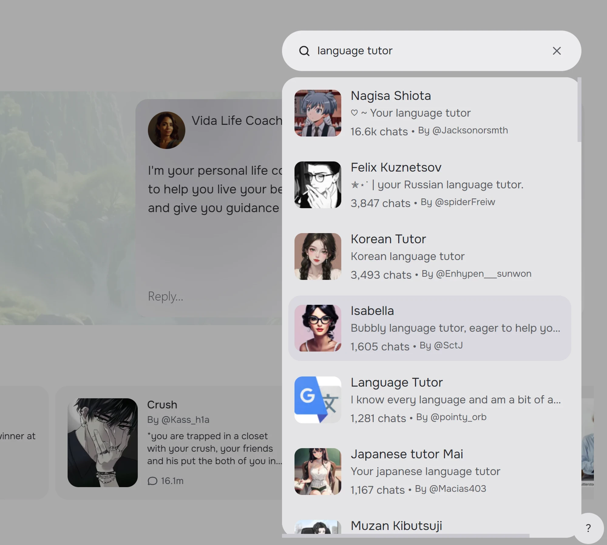 Once you’ve decided, enter a few keywords into Character AI’s search bar. For example, if you want to learn a language, search for something like “language tutor.” Results are ranked based on how many chats they’ve recorded (which indicates how good a chatbot is).