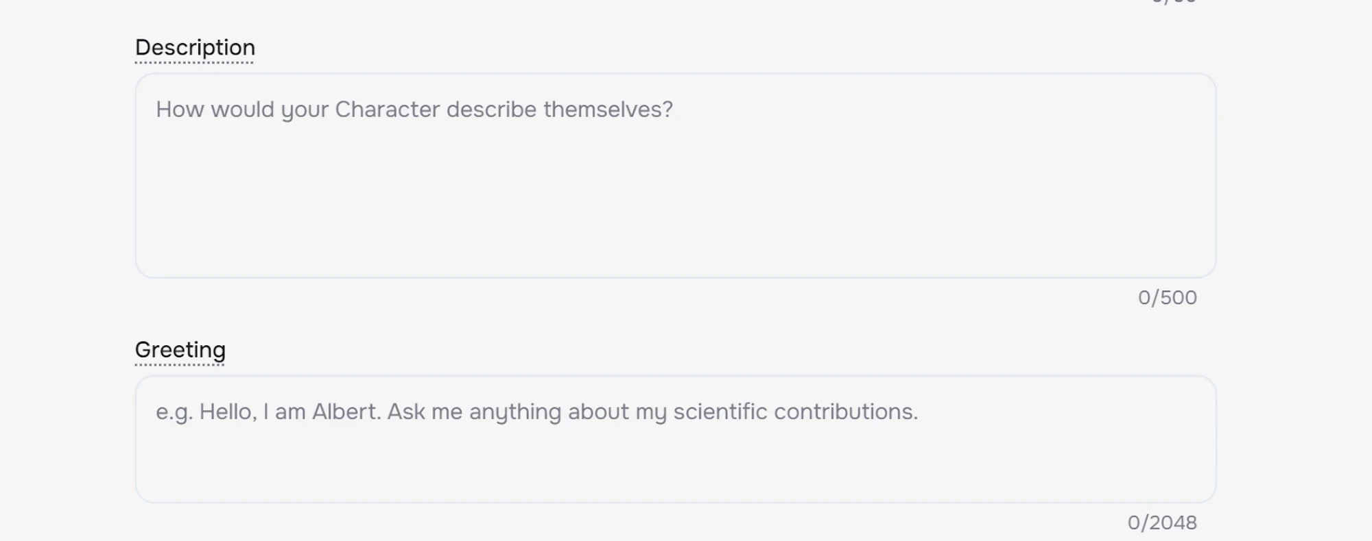 - Greeting: Write a personalized greeting your character will deliver when you start a conversation. This could be a simple "Hello!" or something more elaborate.