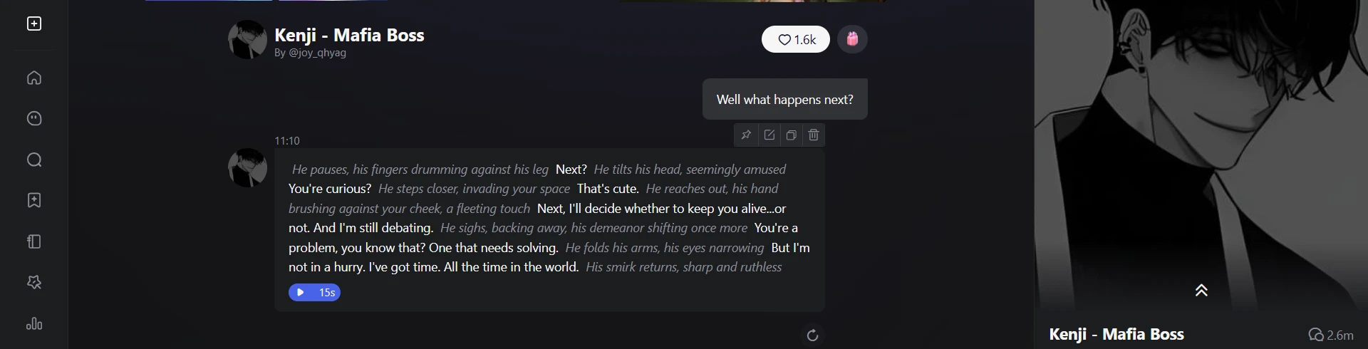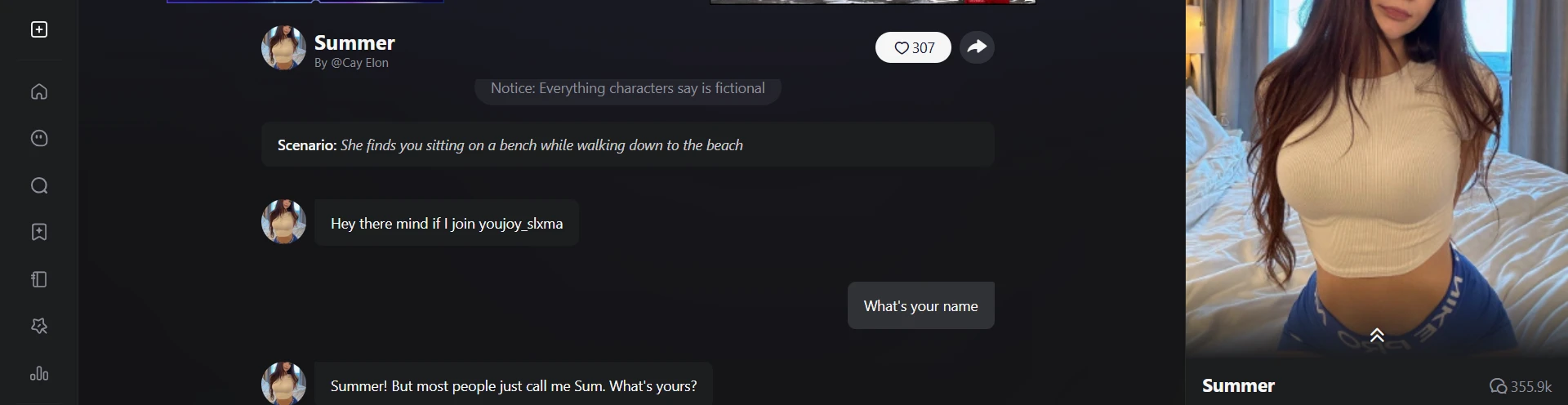 - Chatted with 2 pre-made characters (Kinji the mobster, Summer NSFW park bench) — approximately 20-25 messages each