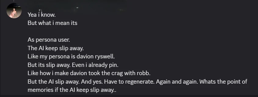- Main tradeoff: Memory retention is so poor that it makes extended roleplay nearly impossible