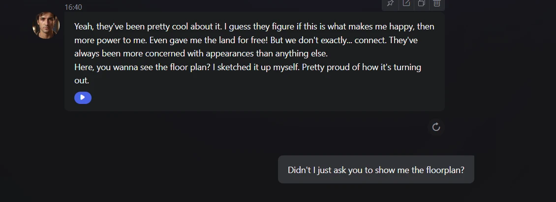 - Characters resist user direction — attempts to steer conversations often fail, creating circular or forced narratives