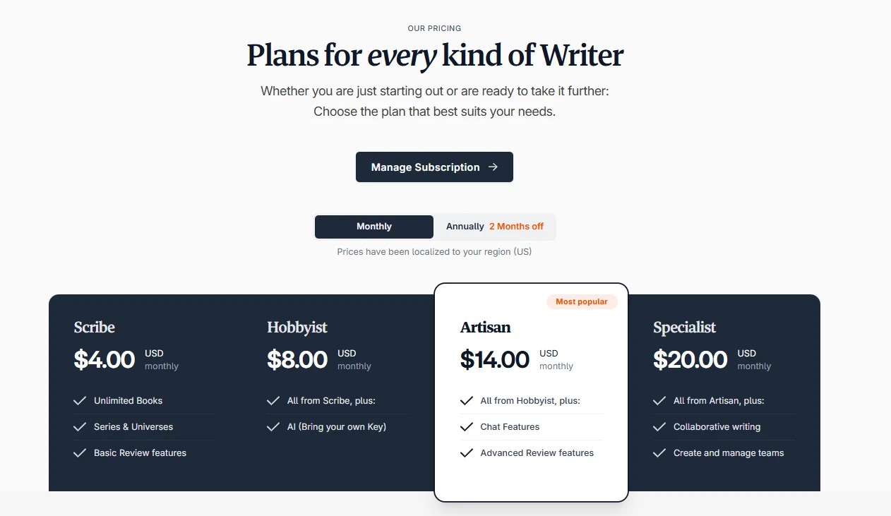 - Specialist: $20/month (paid monthly) or $200/month (paid annually) — This plan includes everything in the Artisan plan plus team management features. This means that several users can work within the same story universe and the same Codex.