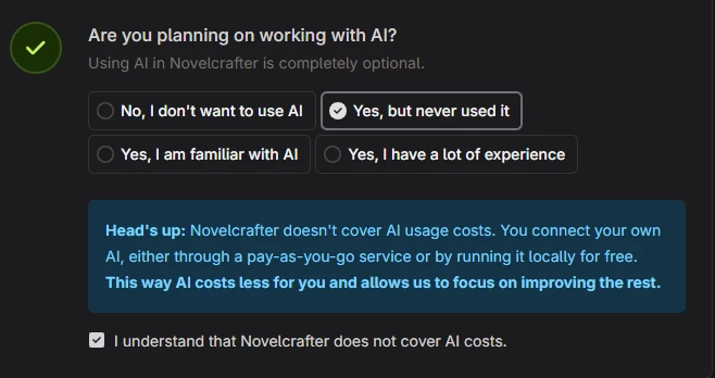 One important thing to note is that the subscription does not include AI usage costs. Novelcrafter only covers access to the platform and its features, but you still need to connect your own AI provider through an API key.