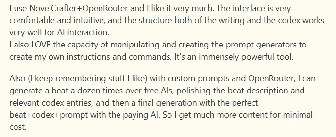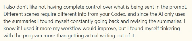 Users also complained that the platform restricted their creative freedom. They said they didn’t like not having full control over what goes into the prompt, since different scenes require different Codex information. Because the AI relies on summaries, it often has to keep going back and editing those summaries for each scene. Instead of focusing on writing, they felt like they were spending more time adjusting settings and fine-tuning the system.