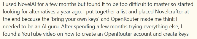 However, as we reviewed sentiments around Novelcrafter, we found that the steep learning curve for the BYOK system was a common complaint. Many users felt that connecting AI keys from providers, tokens, and choosing an AI model required them to have advanced technical experience. Some even mentioned that they felt like they had to be AI gurus to get started, and this led to them leaving the platform.