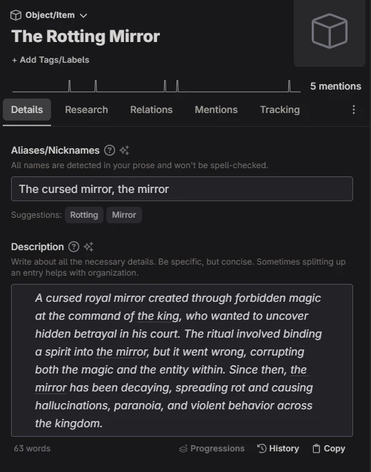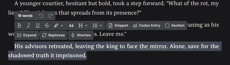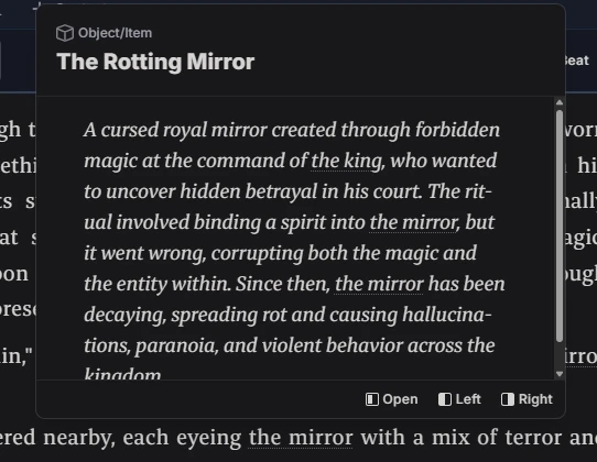 As mentioned, we used a custom story, The Rotting Mirror, as our project to test Novelcrafter and its features.