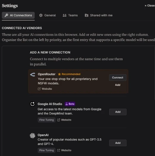 We decided to go with the recommended option and chose OpenRouter, which is marketed as a one-stop shop for accessing multiple models, including both proprietary and NSFW-friendly models.