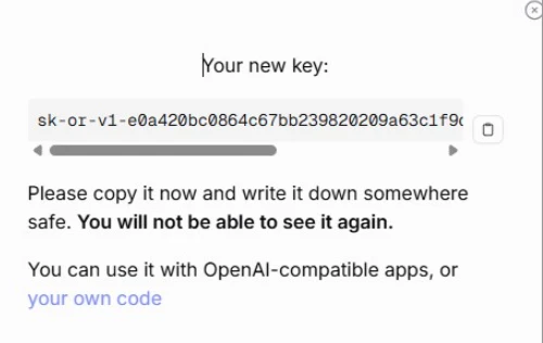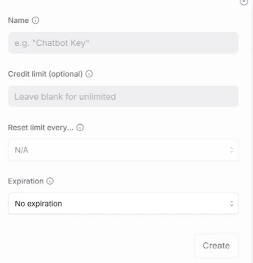 From there, we had to create an OpenRouter account and generate an API key. During this process, you can customize things like the key name, credit limit, reset time, and expiration time.