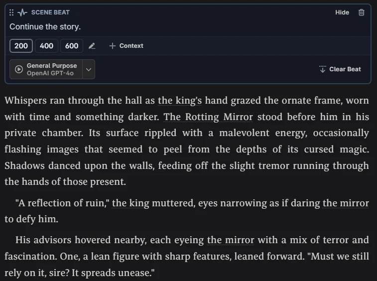 To get a feel for how Novelcrafter works, we spent about four hours testing the platform and created an original story called The Rotting Mirror.