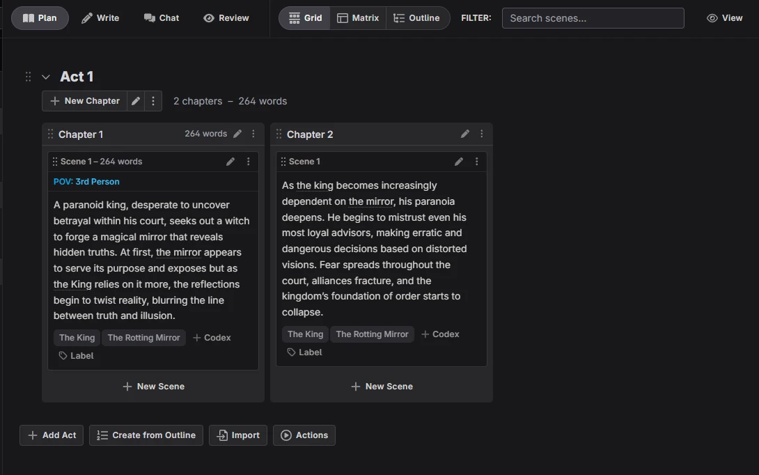 Instead of a storyboard tool, Novelcrafter uses the Plan tab with a grid view, where each card represents a chapter and its summary. You can easily rearrange the order of your acts, chapters, and scenes. Although this is the main way of laying out your story, there are two other ways to view it: