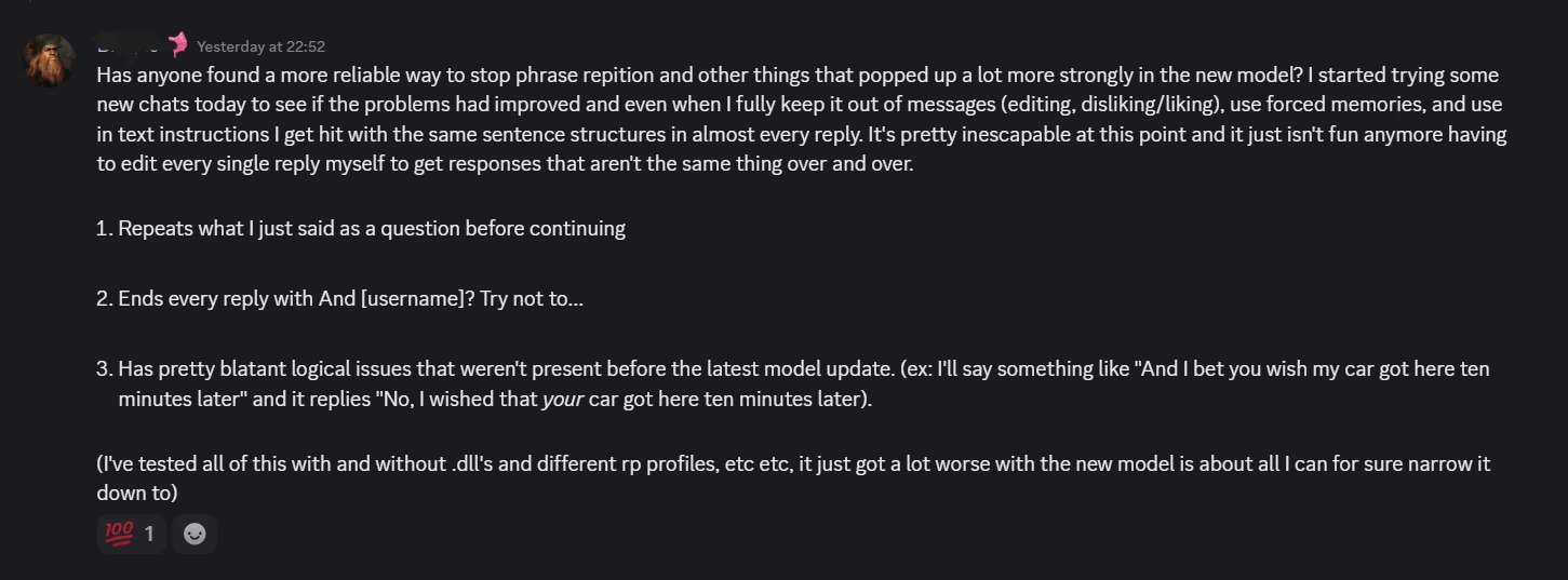 However, some of the community complaints centered on a similar issue that users often encounter in long-term conversations: repetitive responses.