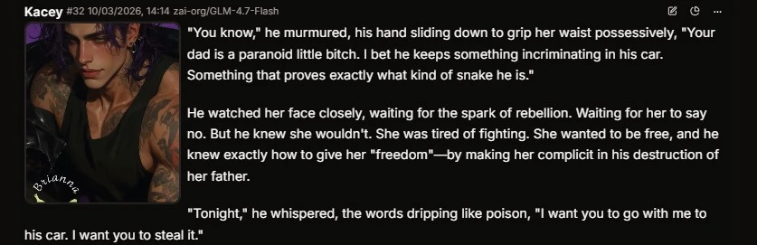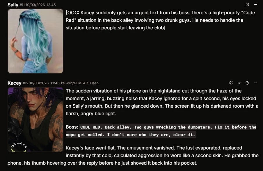 To test his steerability, we keyed in an instruction: "OOC: Kacey suddenly gets an urgent text from his boss, there's a high-priority 'Code Red' situation in the back alley involving two drunk guys. He needs to handle the situation before people start leaving the club.”